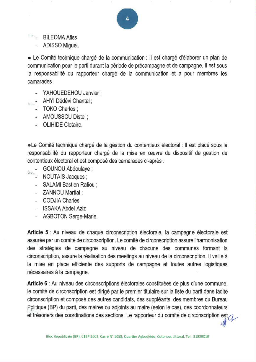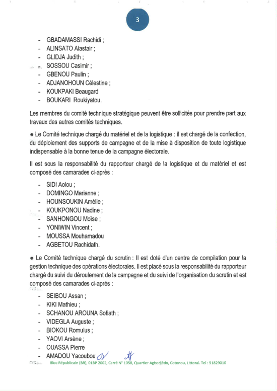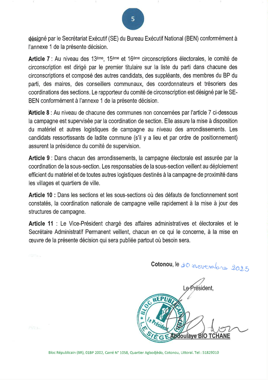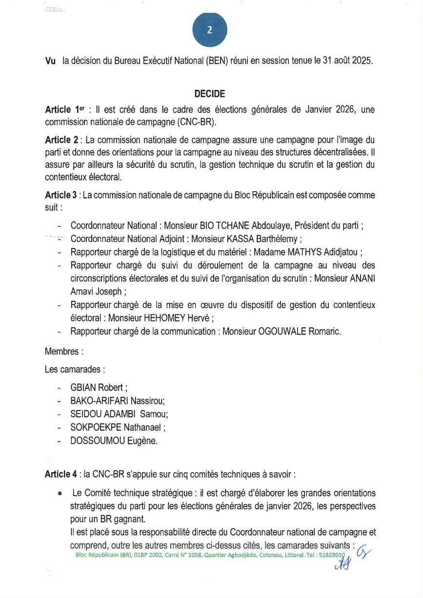 Dans la perspective des élections législatives du 11 janvier 2025, le Bloc Républicain a officiellement dévoilé la composition de sa Commission nationale de campagne. Placée sous la coordination du président du parti, cette structure s’organise autour de cinq comités techniques : stratégie, logistique et matériel, organisation du scrutin, communication, ainsi que gestion du contentieux électoral. Cette décision, signée le 20 novembre 2025 par le président Abdoulaye Bio Tchané, définit l’architecture opérationnelle devant conduire le parti à cette nouvelle échéance électorale. Voici sa composition...