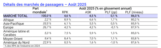 • La demande totale, mesurée en kilomètres-passagers payants (RPK), était en hausse de 4,6 % par rapport à août 2024. La capacité totale, mesurée en sièges-kilomètres offerts (ASK), était en hausse de 4,5 % en glissement annuel. Le coefficient d’occupation des sièges en août était de 86,0 % (+0,1 pp par rapport à août 2024), ce qui constitue un record pour un mois d’août.