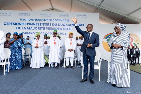 Le duo candidats des partis de la mouvance présidentielle, Romuald Wadagni et Mariam Chabi Talata, a été investi, ce samedi 4 octobre 2025, au stade municipal de Parakou. La cérémonie s’est déroulée en présence des responsables des partis Union progressiste le renouveau (UP-R), le Bloc républicain (BR), le Mouvement des élites engagés pour l’émancipation du Bénin (MOELE-BENIN), la Renaissance nationale (RN), autorités à divers niveaux, militants et sympathisants.