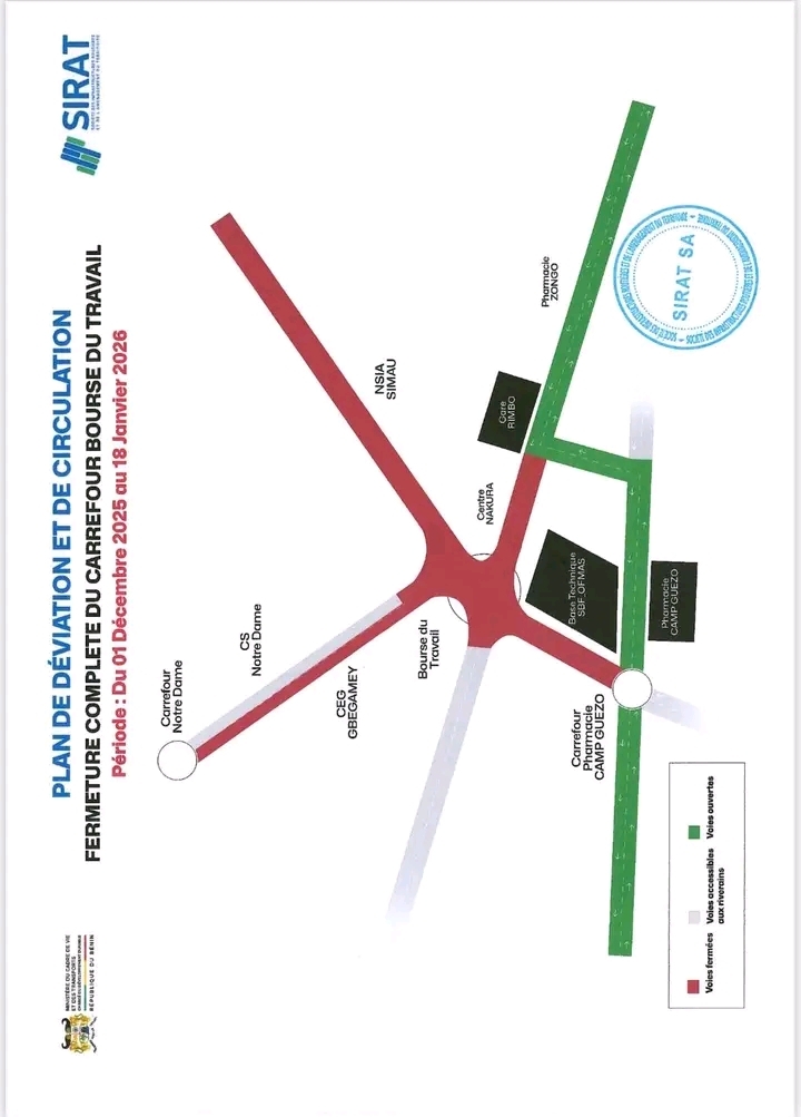 – Du lundi 19 Janvier 2026 au dimanche 15 Mars 2026 : fermeture de la section comprise entre le carrefour bourse du travail et le carrefour de la pharmacie Camp Guézo dans les deux sens.