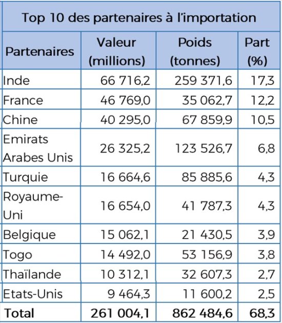 L’Inde est le premier partenaire à l’importation avec une part de 17,3 % soit 259 372 tonnes de biens (riz, huile de pétrole) pour un montant de 66,72 milliards FCFA. Les autres partenaires à l’importation sont respectivement la France (46,77 milliards FCFA), la Chine (40,30 milliards), Emirats Arabes Unis (26,32 milliards de FCFA) et la Turquie (16,66 milliards de FCFA).