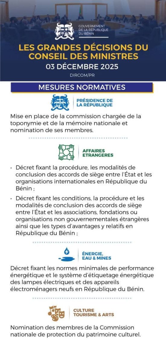 Le Conseil des ministres s’est réuni ce mercredi 03 décembre 2025, sous la présidence du Chef de l’Etat, Patrice Talon. Plusieurs grandes décisions ont été prises au cours de cette séance hebdomadaire.
