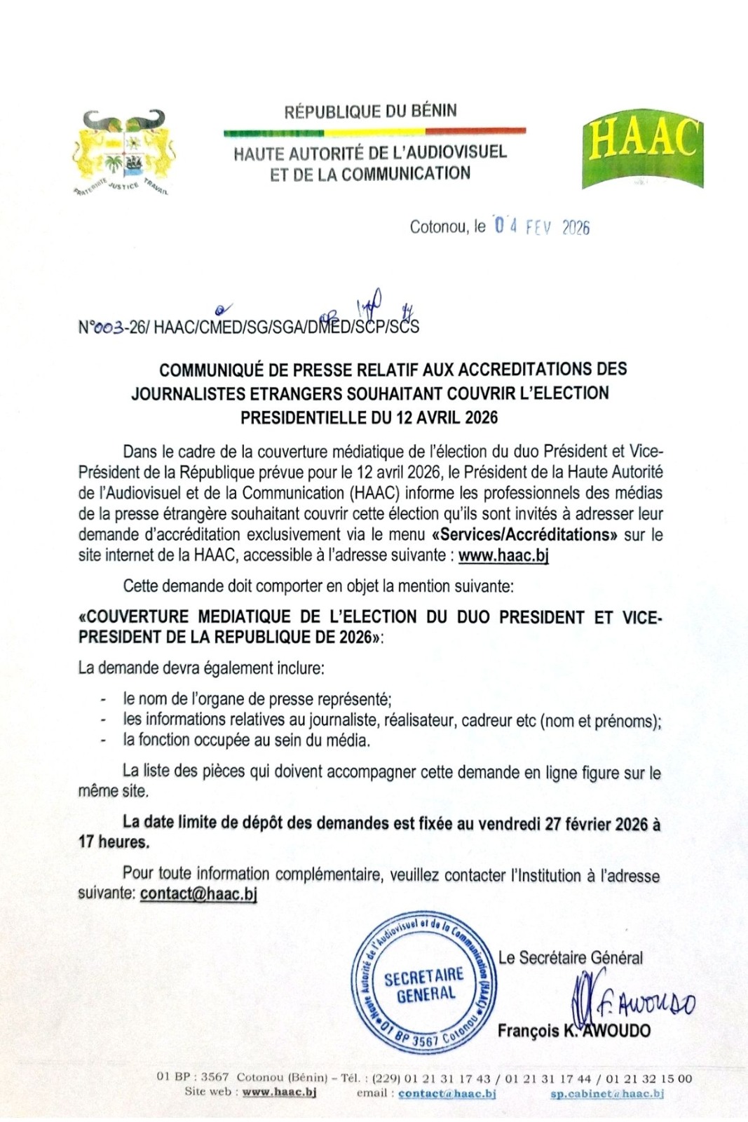 La Haute Autorité de l’Audiovisuel et de la Communication (HAAC) du Bénin a annoncé l’ouverture de l’accréditation pour les médias internationaux souhaitant couvrir l’élection présidentielle, prévue le 12 avril 2026.