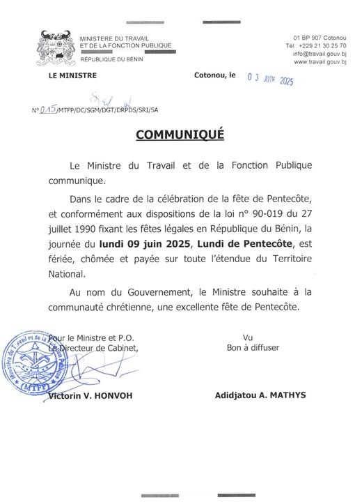 En raison de la fête de la Pentecôte, la journée du lundi 9 juin 2025 est déclarée fériée, chômée et payée sur toute l’étendue du territoire national. Le ministère du travail et de la fonction publique informe le public à travers un communiqué en date de ce mardi 03 juin 2025. Il n’y aura donc pas de boulot pour les travailleurs à cette date. Ceci, conformément aux dispositions de la loi N°90-019 du 27 juillet 1990.