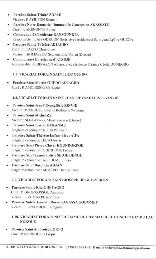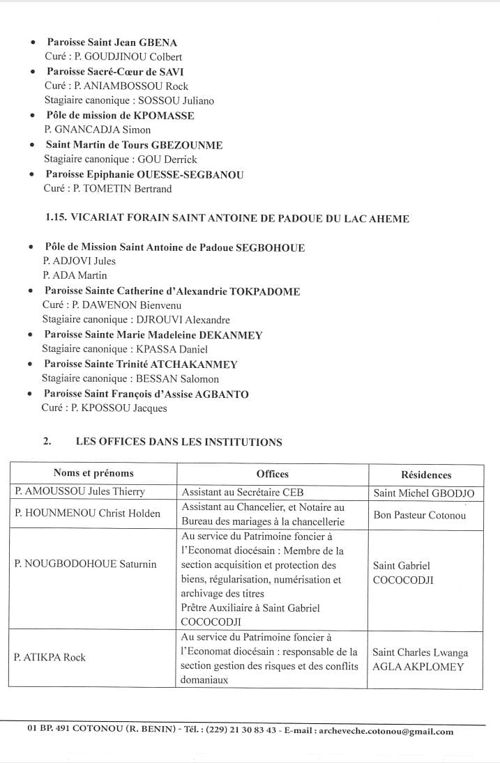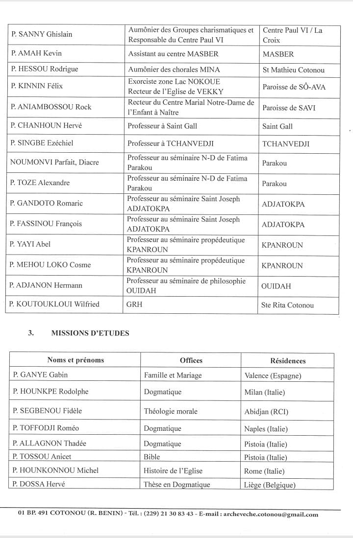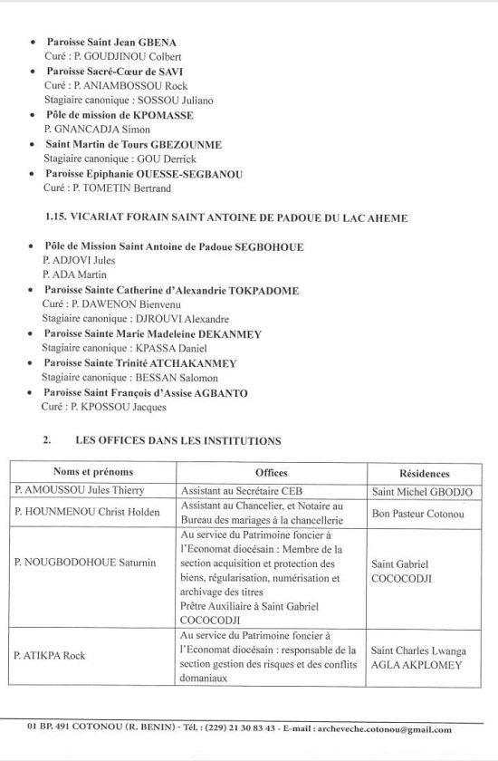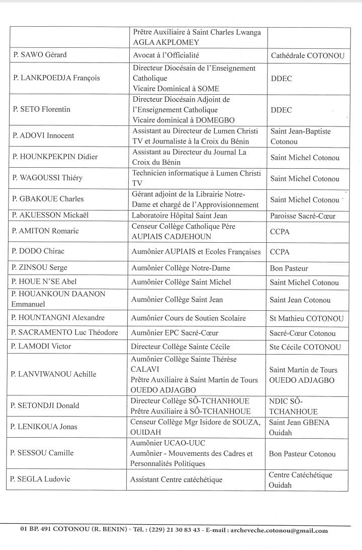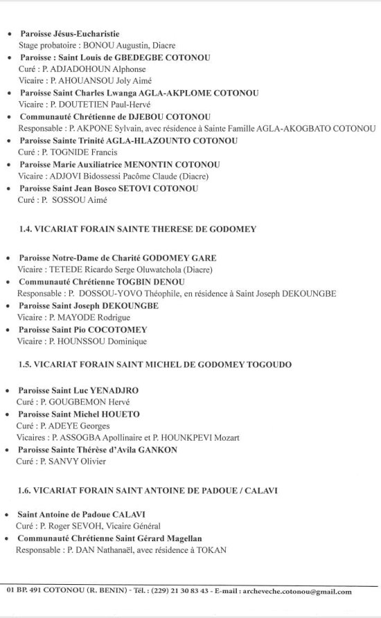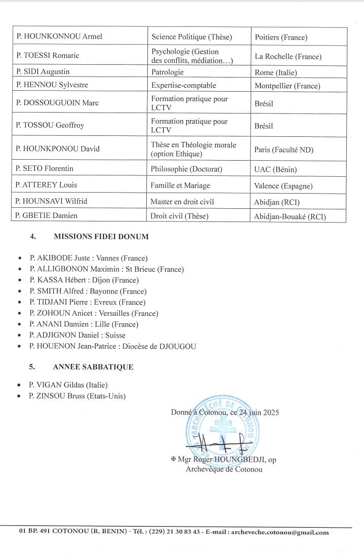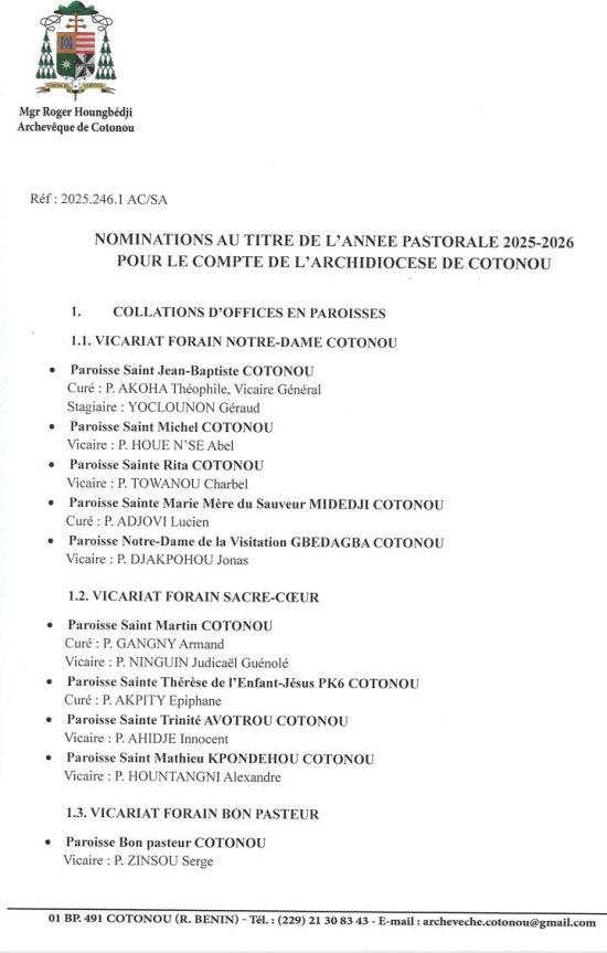 L’archevêque de Cotonou, Mgr Roger Houngbédji, a dévoilé les nouvelles nominations de curés et vicaires pour l’année pastorale 2025-2026. Retrouvez ci-dessous la liste complète des affectations au sein de l’Église catholique au Bénin.