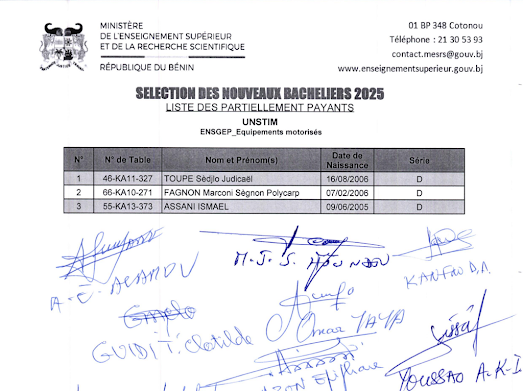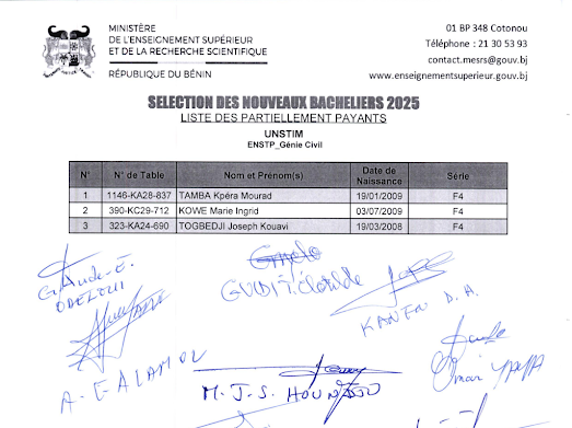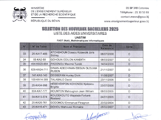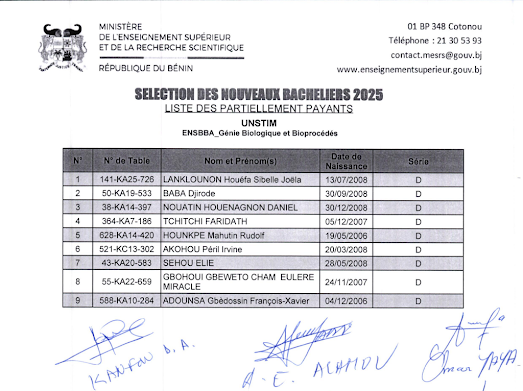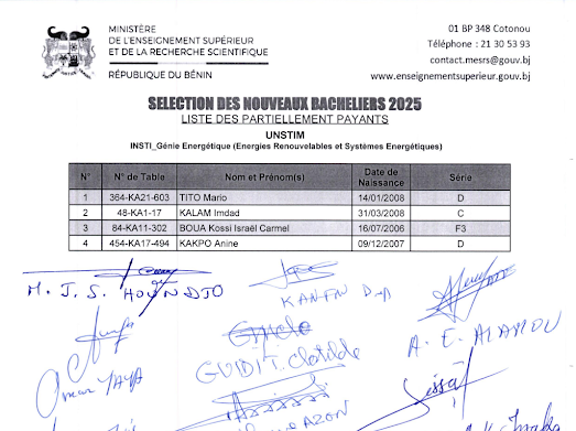La liste des nouveaux bacheliers bénéficiaires de bourses partiellement payantes au titre de l’année académique 2025-2026, à l’Université nationale des sciences, technologies, ingénierie et mathématiques (UNSTIM).