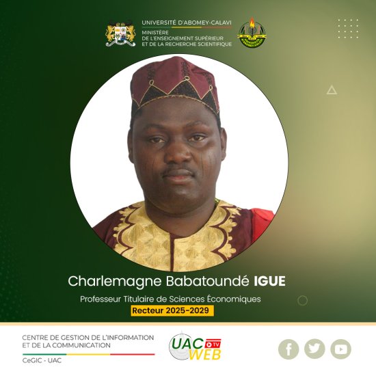 Charlemagne Babatoundé IGUE, recteur de l’UAC. Sa nomination a été prononcée ce mercredi 17 septembre 2025, en Conseil des ministres. Le nouveau recteur est un économiste de formation. Il fut doyen de la Faculté des sciences économiques et de gestion (FASEG). Le nouveau recteur a obtenu sa maîtrise à l’UAC en 1997, un DEA à l’Université Félix Houphouët-Boigny en 2000, et un doctorat à l’Université de Ouagadougou en 2006.