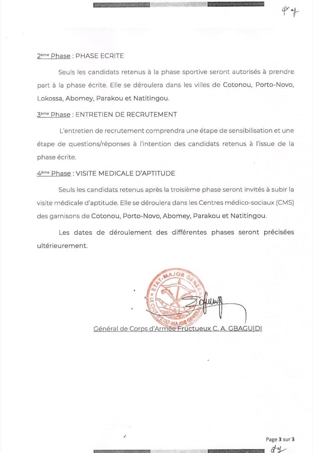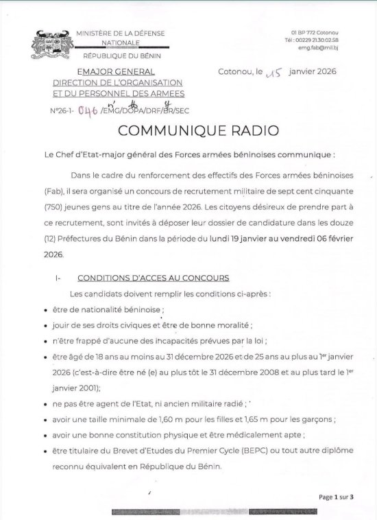 L’armée béninoise procède au renforcement de ses effectifs. Un recrutement de 750 jeunes militaires est annoncé pour l’année 2026. Le chef d’Etat-major général des Forces armées béninoises (FAB), le Général Fructueux Gbaguidi, à travers un communiqué radio en date du jeudi 15 janvier 2026, a informé le public.