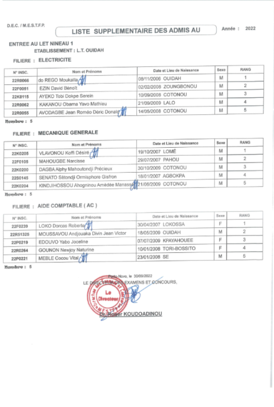 La direction des examens et concours a rendu publique la liste des candidats admis au concours d’entrée au Lycée technique de Ouidah au titre de l’année scolaire 2022-2023.