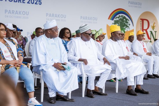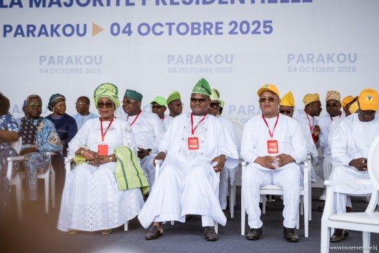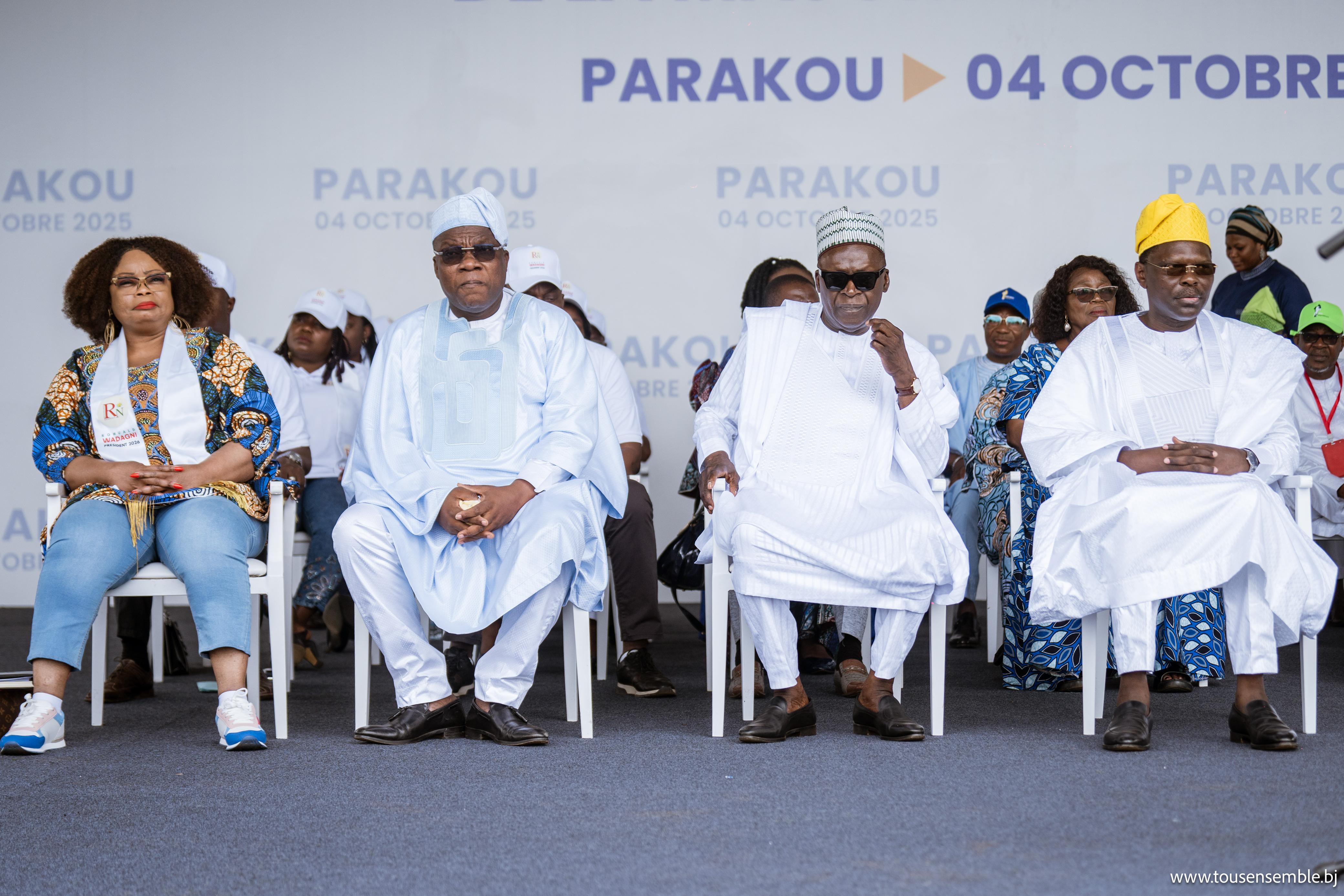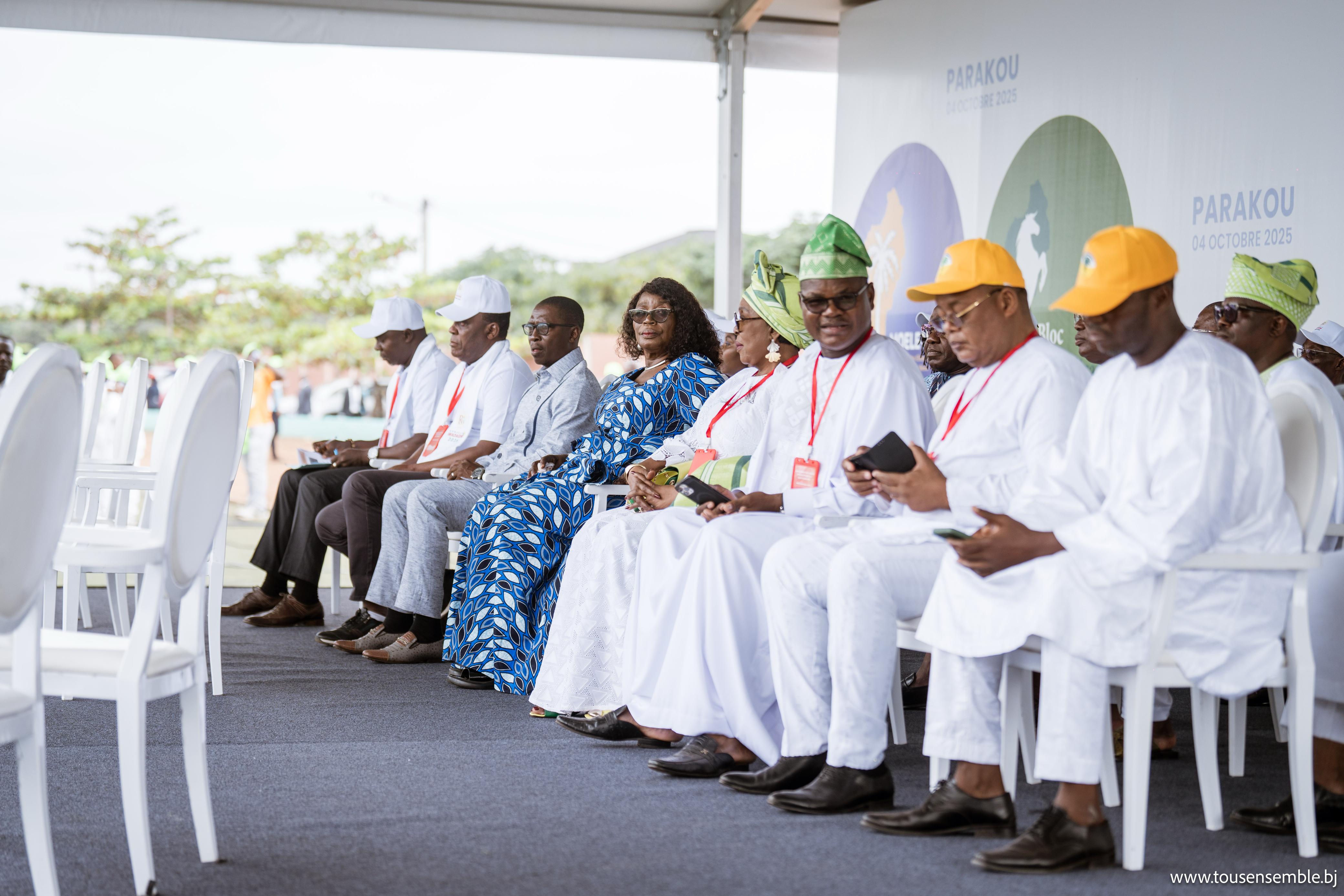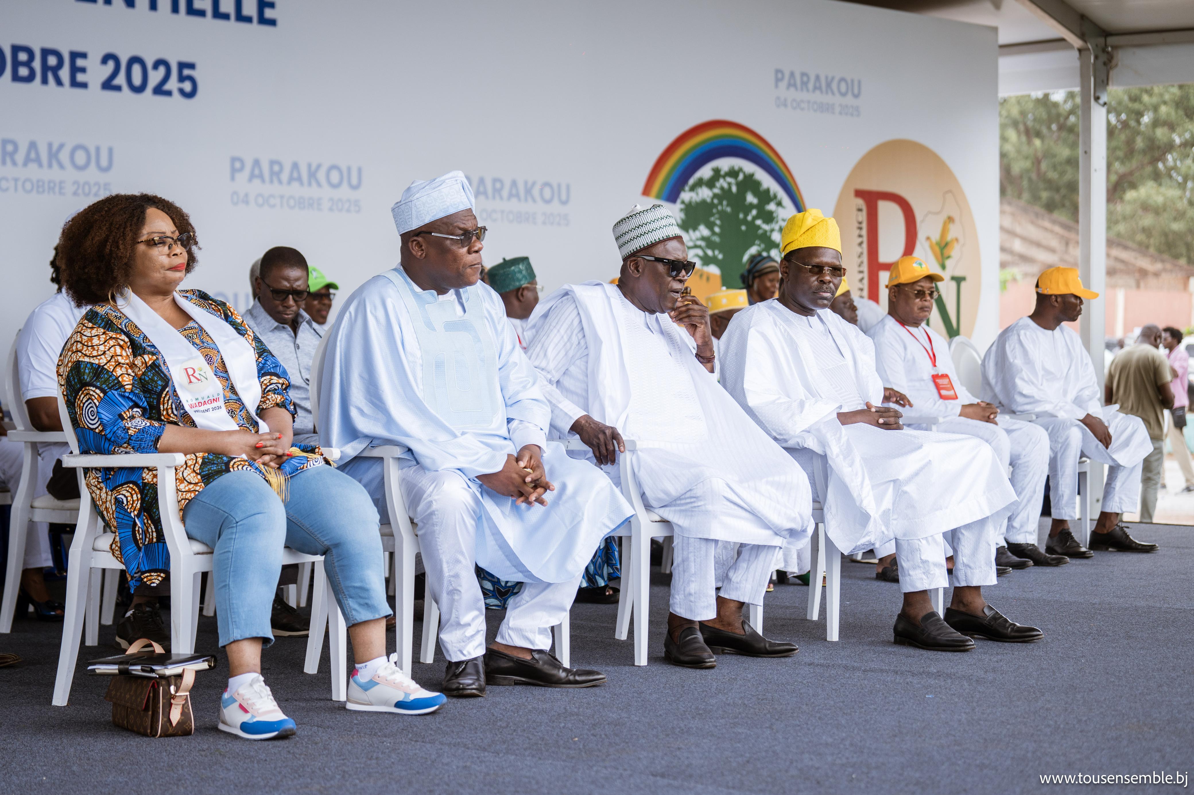 Le stade municipal de Parakou a accueilli ce samedi 04 octobre 2025, la cérémonie d’investiture de Romuald Wadagni-Mariam Talata, duo candidat de la mouvance à l’élection présidentielle 2026. Tous les présidents des quatre partis politiques de la majorité présidentielle (UPR, BR, Moele Bénin et Renaissance Nationale ) ainsi que le président de l’Assemblée nationale sont présents à Parakou. Les militants ont fait massivement le déplacement. Le stade municipal de Parakou est plein comme un oeuf. En images, les temps forts de cette cérémonie.