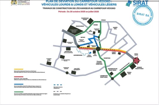 Une fermeture partielle du carrefour Vèdoko (Cotonou) est prévue à compter du dimanche 26 octobre 2025 et ce, jusqu’en juillet 2026. C’est dans le cadre de la réalisation des travaux de construction de l’échangeur du Carrefour Vèdoko. En raison desdits travaux, la circulation sur cet axe connaîtra des perturbations temporaires. Les usagers sont invités à respecter les limitations de vitesse, à suivre les consignes de sécurité et les indications des panneaux de signalisation, et à emprunter les couloirs de circulation provisoires mis en place pour faciliter le bon déroulement de ces travaux d’intérêt public.