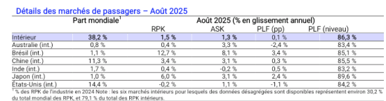 • La demande totale, mesurée en kilomètres-passagers payants (RPK), était en hausse de 4,6 % par rapport à août 2024. La capacité totale, mesurée en sièges-kilomètres offerts (ASK), était en hausse de 4,5 % en glissement annuel. Le coefficient d’occupation des sièges en août était de 86,0 % (+0,1 pp par rapport à août 2024), ce qui constitue un record pour un mois d’août.