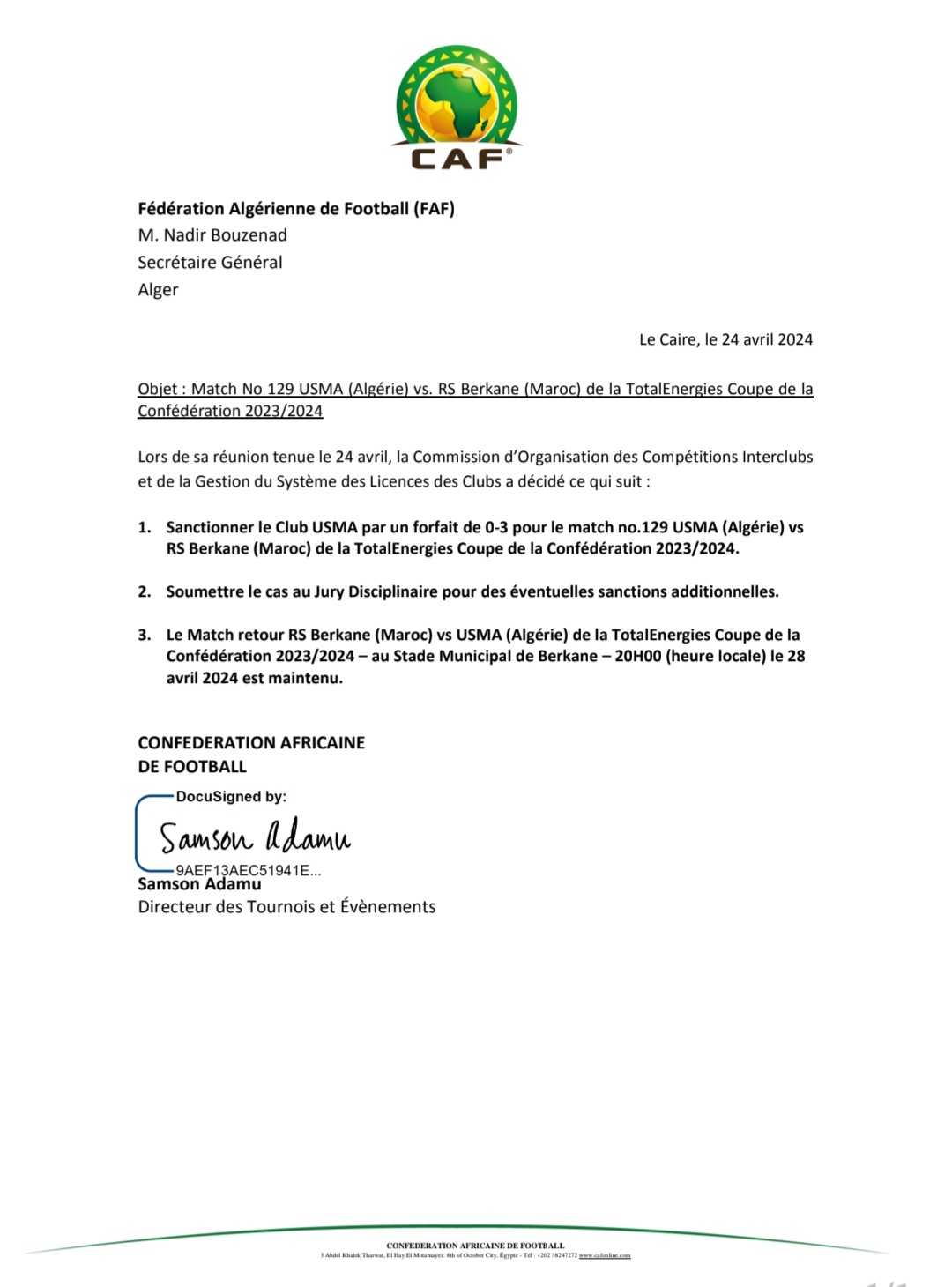l’incident qui s’est produit à Alger avant le match qui devrait l’opposer à la RS Berkane (Maroc) dans le cadre de la Coupe de la Confédération 2023/2024. Lors de sa réunion tenue, au Caire, ce 24 avril 2024, la Commission d’Organisation des Compétitions Interclubs et de la Gestion du Système des Licences des Clubs a décidé de sanctionner le Club USMA par un forfait de 0-3 en faveur du club marocain. Des sanctions additionnelles pourraient être prises à l’encontre du club algérien. (Voir Décision de la CAF).