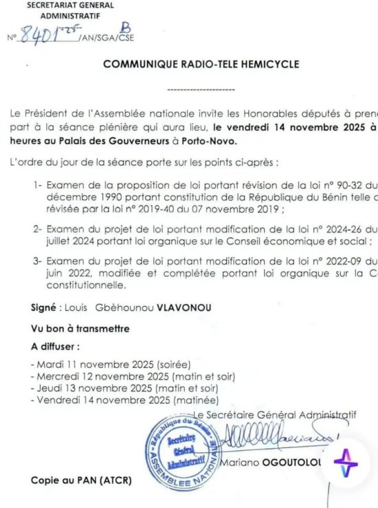L’Assemblée nationale se réunira en séance plénière, vendredi 14 novembre 2025, à 10 heures, au Palais des Gouverneurs à Porto-Novo.