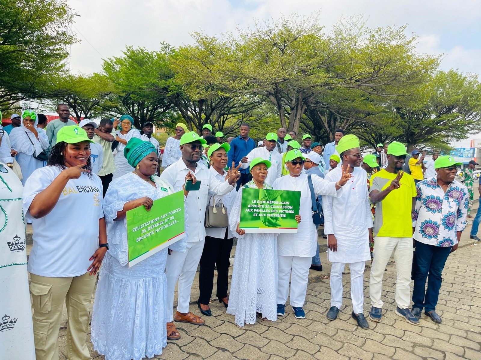 Femmes, jeunes, représentants de cultes endogènes et d’Organisations de la Société Civile (OSC) ont marché du siège du Bloc Républicain (BR) jusqu’à la place de l’Étoile Rouge, avant de revenir au lieu de départ dans la matinée du mercredi 10 décembre 2025. Vêtus de blanc, casquettes vertes vissées sur la tête, les manifestants brandissaient des pancartes portant des messages tels que : « Apatrides, vous avez échoué » ; « Aucun acte de sabotage ne détournera le Bénin » ; « Le Bénin toujours debout », « Plus unis, plus forts ». Sur d’autres, des mots de solidarité se lisaient : « Félicitations aux Forces de défense et de sécurité », « Compassion aux victimes ».