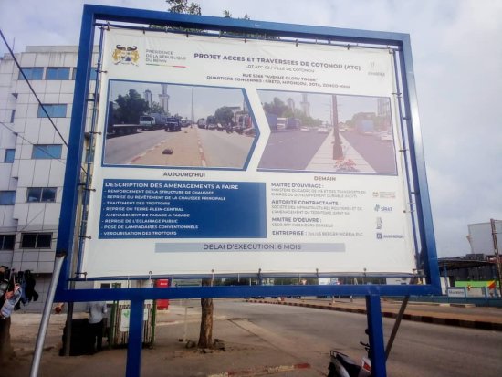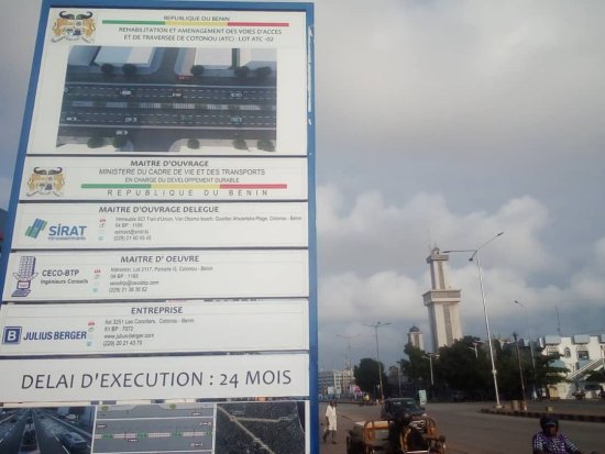 Des panneaux signalétiques posés sur certaines artères de Cotonou annoncent le démarrage du projet de réhabilitation et d’aménagement des voies d’accès et de traversée de Cotonou. Plusieurs aménagements sont prévus dans le cadre du projet.