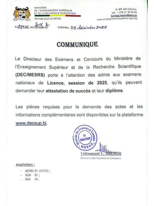 Les candidats déclarés admis à l’examen nationale de Licence en 2025 peuvent déjà demander leur attestation de succès et leur diplôme. Le directeur des examens et concours du ministère de l’enseignement supérieur et de la recherche scientifique à travers un communiqué en date du 05 décembre 2025, a porté l’information à leur connaissance.