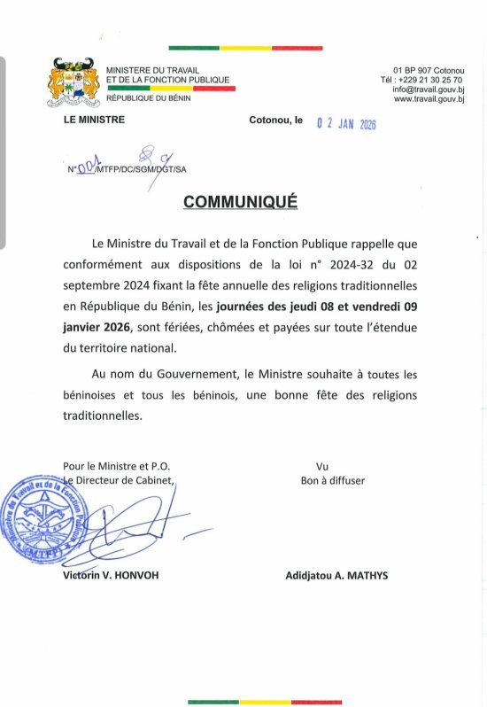 En raison de la fête du Vodun, grand rendez-vous annuel et culturel autour de l’art et de la spiritualité du Vodun, les jeudi 8 et vendredi 9 janvier 2026 sont déclarés fériés, chômés et payés sur toute l’étendue du territoire national.