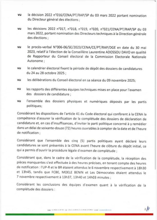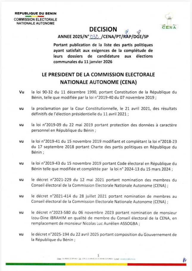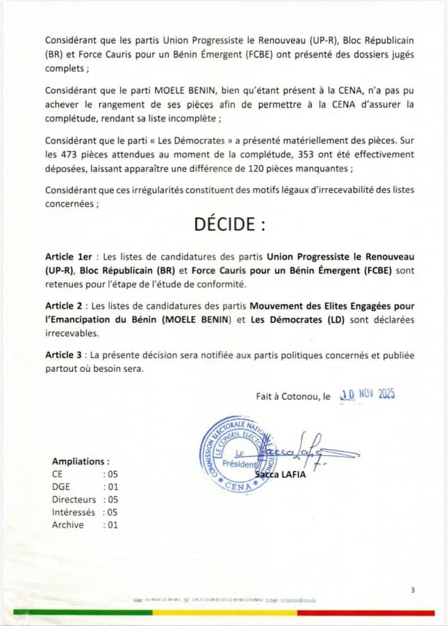 La Commission électorale nationale autonome (CENA) vient de publier la liste des partis politiques ayant satisfait aux exigences de la complétude de leurs dossiers de candidature aux élections communales du 11 janvier 2026. Seuls U-PR, BR et FCBE sont en règle. Par contre Les Democrates (LD) et MOELE-BENIN n’ont pas été retenus pour dossiers incomplets. Pour le parti LD par exemple, "𝗦𝘂𝗿 𝗹𝗲𝘀 𝟰𝟳𝟯 𝗽𝗶è𝗰𝗲𝘀 𝗮𝘁𝘁𝗲𝗻𝗱𝘂𝗲𝘀 𝗮𝘂 𝗺𝗼𝗺𝗲𝗻𝘁 𝗱𝗲 𝗹𝗮 𝗰𝗼𝗺𝗽𝗹é𝘁𝘂𝗱𝗲, 𝟯𝟱𝟯 𝗼𝗻𝘁 été 𝗲𝗳𝗳𝗲𝗰𝘁𝗶𝘃𝗲𝗺𝗲𝗻𝘁 𝗱é𝗽𝗼𝘀é𝗲𝘀, 𝗹𝗮𝗶𝘀𝘀𝗮𝗻𝘁 𝗮𝗽𝗽𝗮𝗿𝗮î𝘁𝗿𝗲 𝘂𝗻𝗲 𝗱𝗶𝗳𝗳é𝗿𝗲𝗻𝗰𝗲 𝗱𝗲 𝟭𝟮𝟬 𝗽𝗶è𝗰𝗲𝘀 𝗺𝗮𝗻𝗾𝘂𝗮𝗻𝘁𝗲𝘀 ". (Voici la Décision de la CENA)