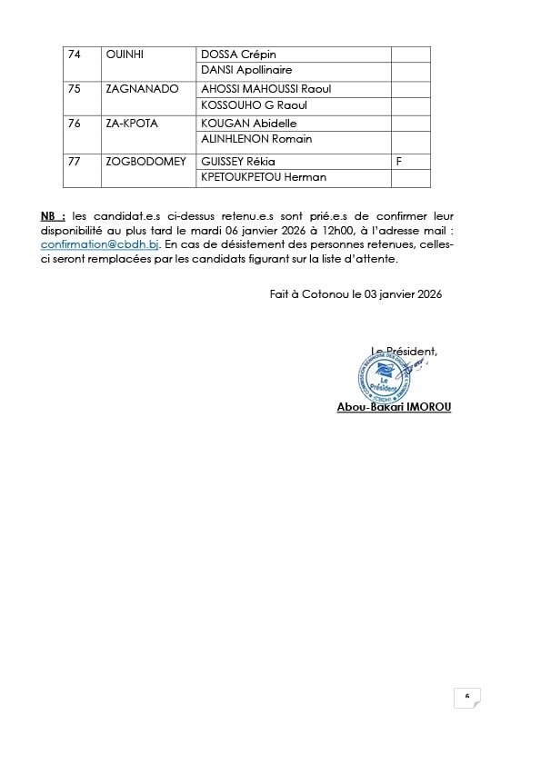Suite à l’appel à candidatures lancé en décembre dernier pour le suivi des élections générales, la Commission Béninoise des Droits de l’Homme (CBDH) a rendu public le communiqué final portant sélection des moniteurs communaux. Sur un total de 6 350 dossiers étudiés pour 164 postes à pourvoir, l’institution a sélectionné des représentants pour les 77 communes. LISTE...
