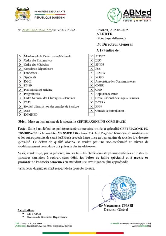 L’Agence Béninoise du Médicament et des autres produits de santé (ABMed) procède à une mise en quarantaine de la spécialité CEFTRIAXONE INJ COMBIPACK du laboratoire MAXMED Lifescience Pvt. Ltd. Il est constaté un défaut de qualité sur certains lots de cette spécialité. Il s’agit notamment d’une non-conformité au niveau du conditionnement secondaire qui présente des incohérences. Les établissements pharmaceutiques et les structures sanitaires sont invités à retirer les boîtes de ladite spécialité et à mettre en quarantaine les stocks concernés.