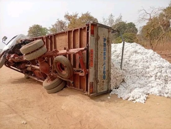 Un camion six roues chargé de coton a basculé sur le côté, déversant l’intégralité de sa cargaison d’« or blanc » sur la chaussée.