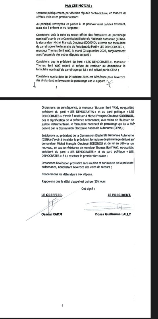 Sur requête du député Sodjinou François, le Tribunall de Première Instance de Cotonou, statuant en référé à ordonner à Boni Yayi , la restitution du parrainage au député, ordonne à la Cena d’établir au requérant un autre parrainage en cas de refus du président des LD