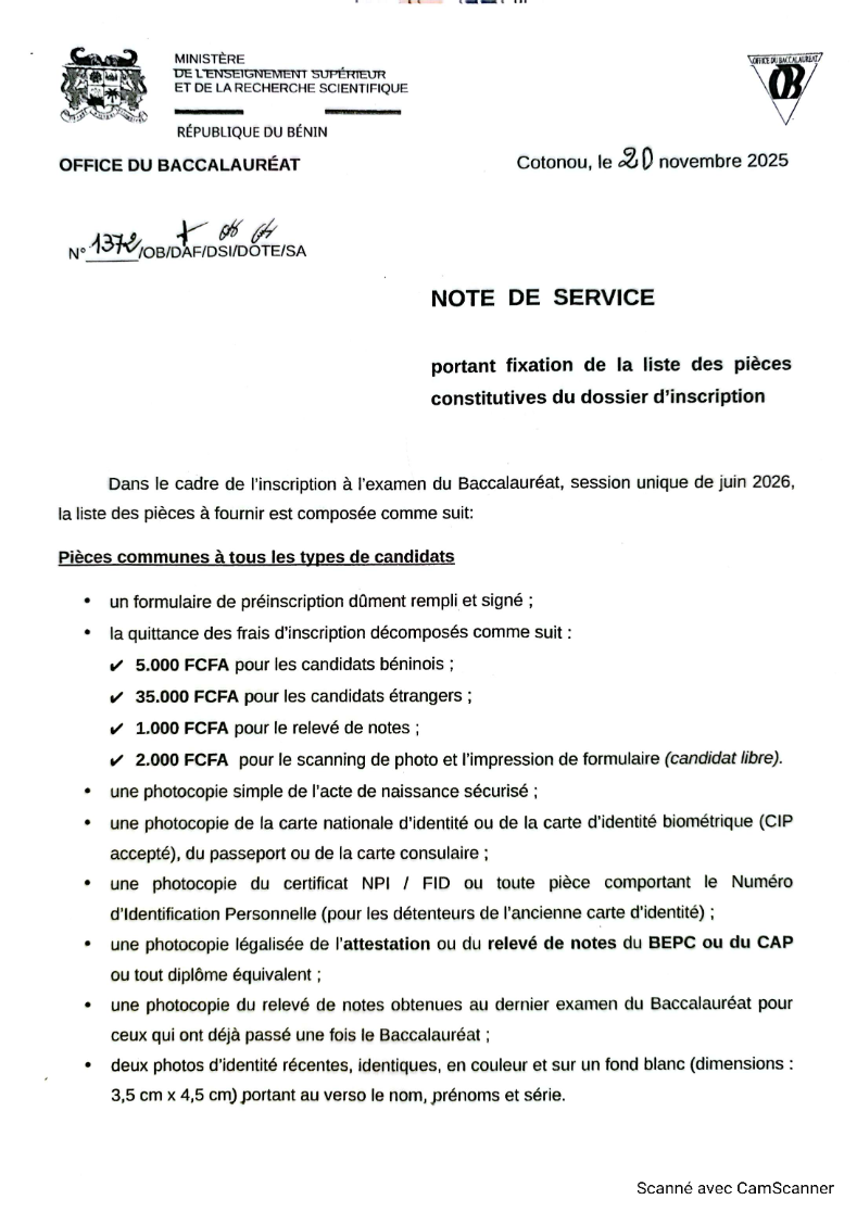 L’Office du Baccalauréat a communiqué la liste des pièces nécessaires pour le dossier d’inscription à l’examen du Baccalauréat, session de juin 2026. Voici les précisions de la note de service signé par le DOB.