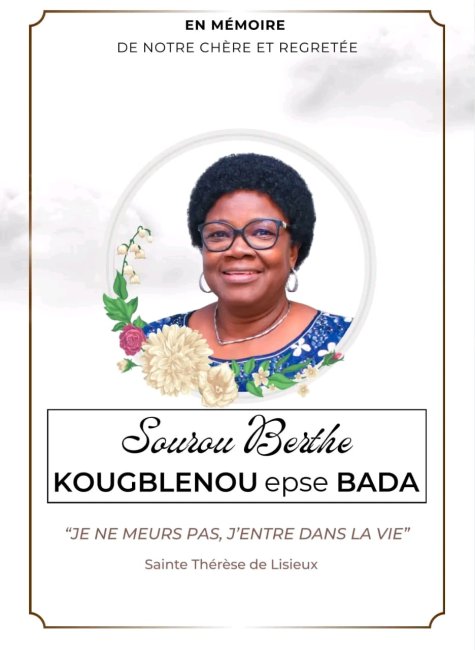 Sourou Berthe KOUGBLENOU, l’épouse du général de corps aérien BADA Bertin, sera inhumée le jeudi 15 janvier 2025. Voici le programme officiel des obsèques. La famille BADA a rendu public le programme officiel des obsèques de Sourou Berthe KOUGBLENOU épouse BADA, qui se dérouleront à Akassato. Les cérémonies débuteront le mercredi 14 janvier 2026 par une soirée de chants et d’animations spirituelles prévue à partir de 20 heures au domicile de la défunte, connu sous l’appellation maison (…)